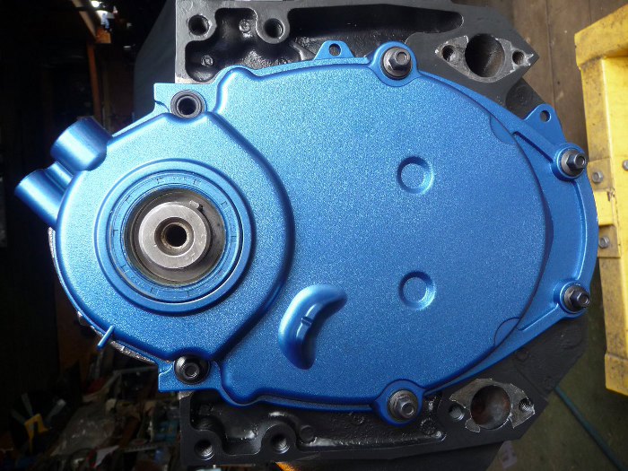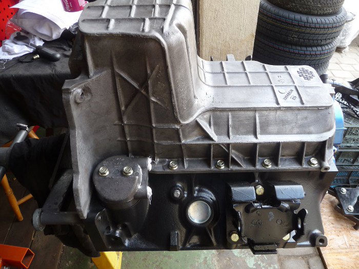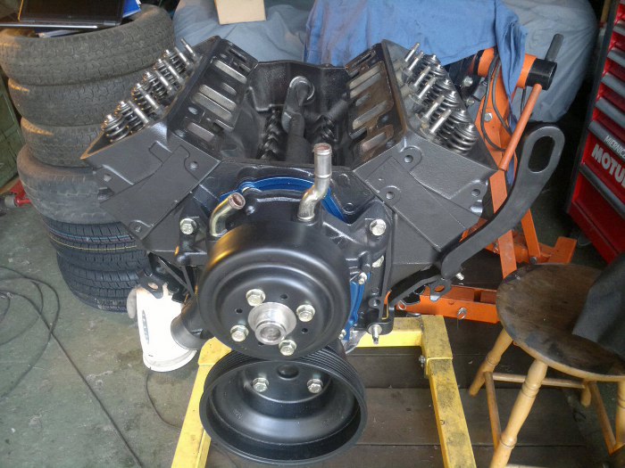 Jedna głowica przykręcona na gotowo, druga na razie tylko założona, bo drugiego kompletu śrub głowicy nie mogę znaleźć. Przykręciłem też pompę wody i koła pasowe.