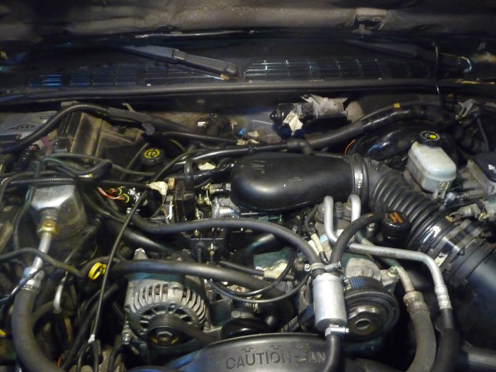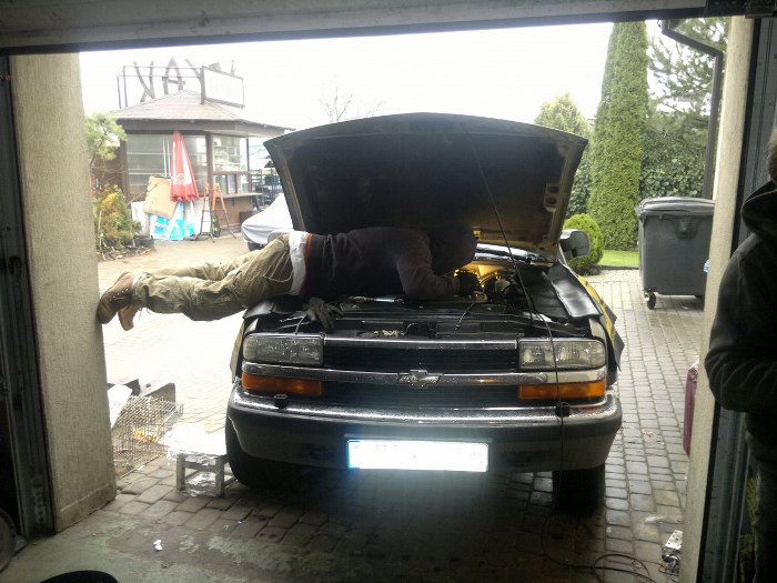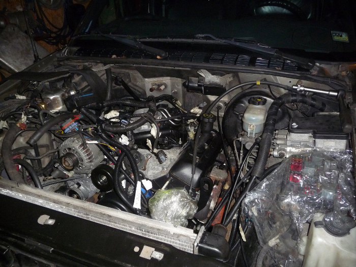 Teraz następuje brak fot z wkładania silnika. Powód jest prosty - te auto nie było pomyślane jako takie, w którym ktoś będzie wymieniał kiedykolwiek silnik. To auto się już powinno wymienić na nowsze :) W komorze silnika jest potwornie ciasno. Dość powiedzieć, że wkładanie i podłączanie wszystkiego zajęło kilka dni roboczych. Tak tam jest ciasno pod maską. Tu widać silnik jeszcze przed fazą układania i podłączania wszystkiego.