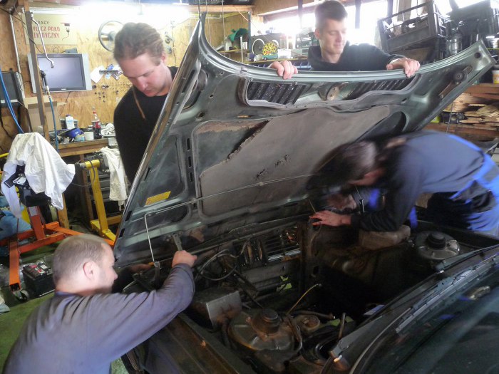 Ponieważ auto wraca do garażu Jędrka, to trzeba je w miarę poskładać. Tu widać przykręcanie maski, które okazało się wymagającym zadaniem... Dobrze, że znajomych tyle mam.