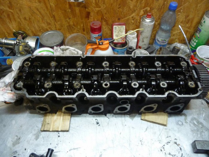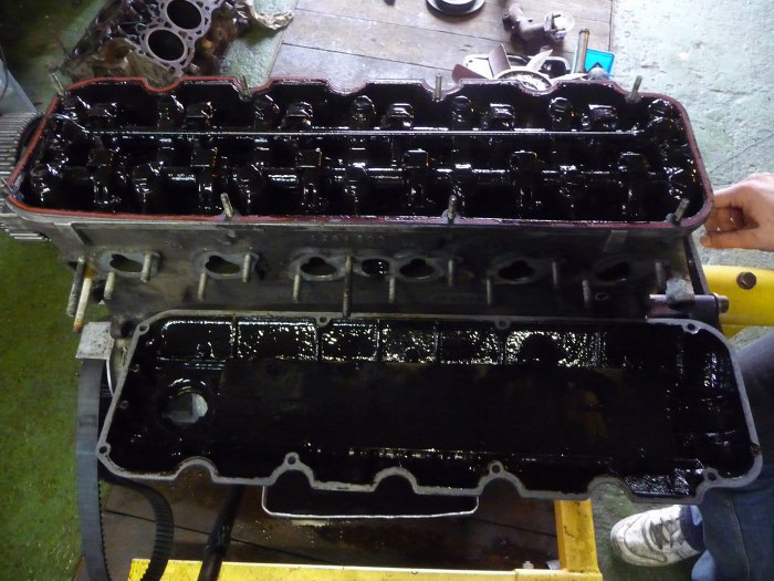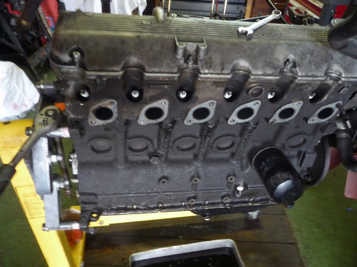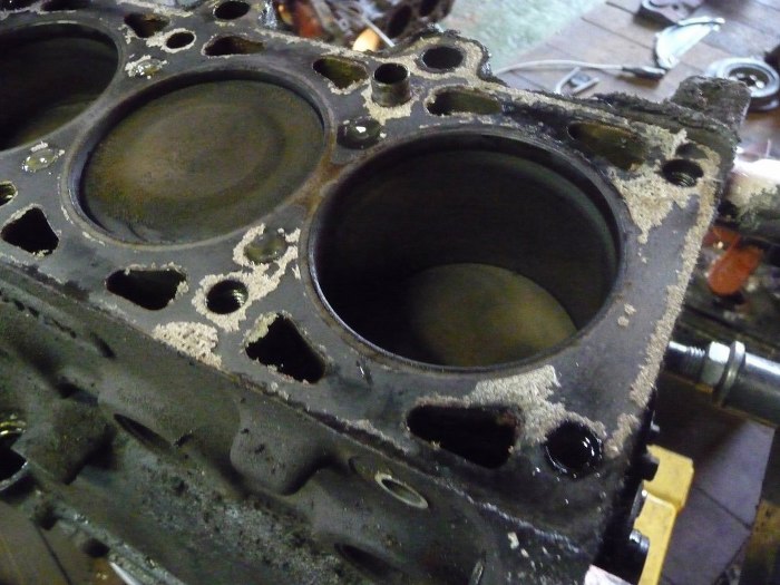 Zdjąłem głowicę. Fajnie, że aluminiowa, bo w sześciocylindrowym silniku ciężko by było unieść żeliwną. W dwóch miejscach były wycieki oleju z uszczelki na zewnątrz silnika. Uszkodzeń uszczelki przy płaszczu wodnym niestwierdzono, podobnie umytych z nagaru tłoków. Gdzie się podziewa płyn chłodzący?
