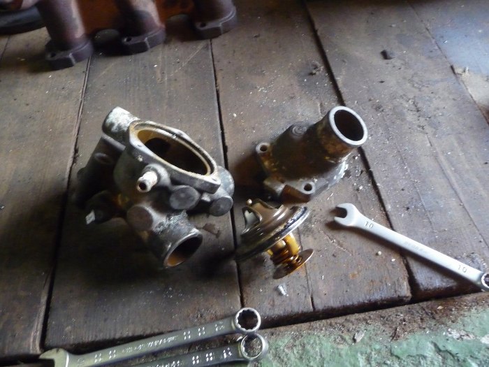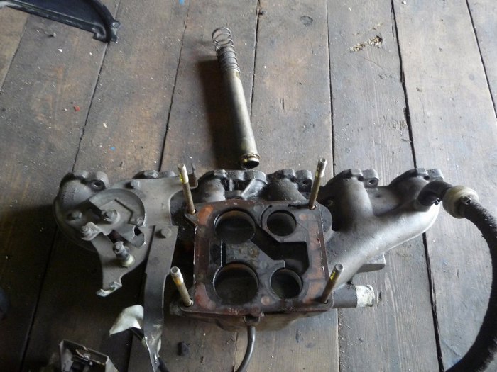Zdjąłem też aparat zapłonowy i obudowę termostatu. Co ciekawe - otwory dolotowe mają taki kształt jakby producent przewidział użycie listwy z wtryskami, ale wtrysk pojawił się dopiero później. Głowica jest oryginalna, data odlewu zgadza się z rokiem produkcji auta.