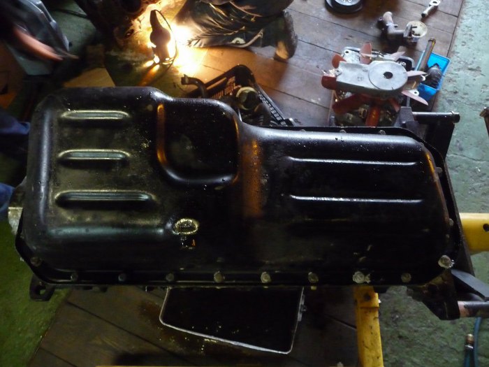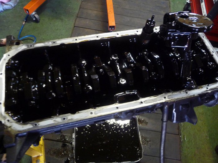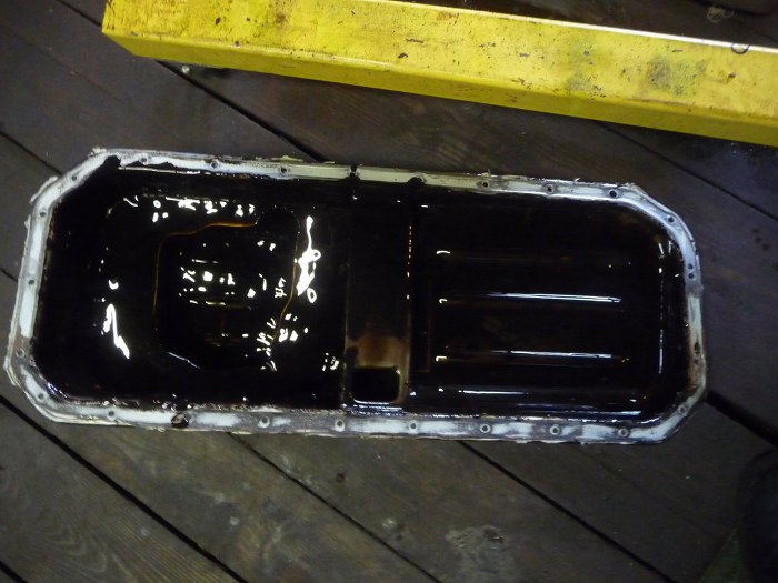 Miska oleju dość płytka, oleju z niej wykapało na moje oko 3-4 litry. Jędrek nie pamiętał ile wchodzi oleju. Na moje oko mało tego :)