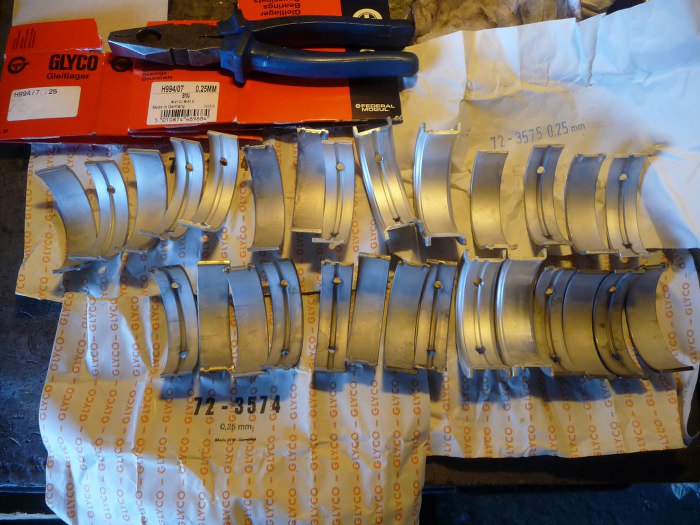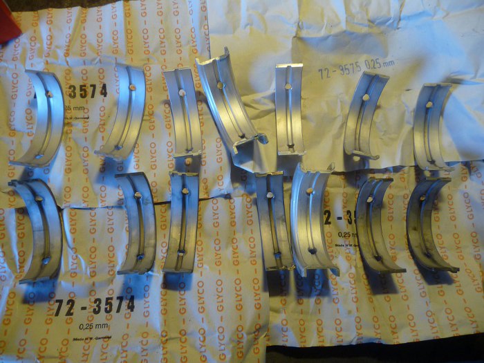 Zawiozłem silnik do szlifierni. Ku wielkiej radości Jędrka (i jego portfela :) ) potwierdziły się moje pomiary, i tłoki zostają stare. Wystarczyło lekkie honowanie cylindrów. Czopy korbowe wału również zostały w nominalnym wymiarze. Jedynie czopy główne wymagały szlifu. Jędrek kupił nowe panewki główne, ale okazało się, że tylko jedna połówka z każdego kompletu jest taka, jak była w silniku. Podjęłiśmy decyzję o kupnie drugiego identycznego kompletu. Na zdjęciu widać już obydwa.