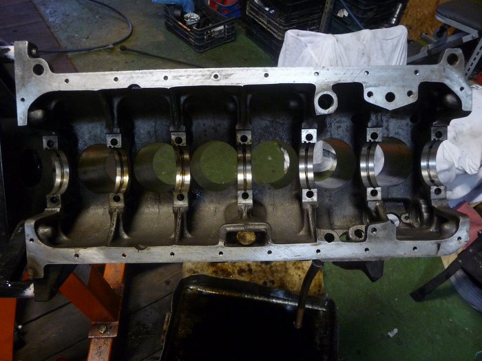 Z tych dwóch kompletów zostawiliśmy tylko te właściwe, według mnie, połówki. Dzięki temu, moim zdaniem, olej będzie lepiej docierał do dolnej połówki panewki tym rowkiem. Taki zestaw dostarczyłem do szlifierni, tam zostało to założone na blok i pod wymiar wewnętrzny panewek, z założonym odpowiednim luzem, został szlifowany wał korbowy. Podczas sprawdzania wału okazało się też, że niektóre podpory są lekko krzywe, więc zostało też zrobione osiowanie wału. Dla tych, którzy nie wiedzą co to - stopy wału lekko się planuje, żeby zmniejszyć średnicę otworu na panewki. Potem honuje się jednym narzędziem wszystkie na raz otwory na panewki w bloku, przy założonych i dokręconych stopach wału.
