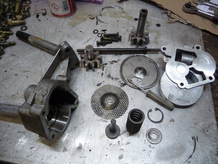 Rozłożyłem pompę oleju i sprawdziłem jej stan. Była niedawno założona nowa, więc nie wymianiamy jej teraz, jest dobra. Wymyłem tylko dokładnie każdy element i sprawdziłem, czy wymiar sprężyny zaworu upustowego ciśnienia oleju jest zgodny ze specyfikacją. Przy rozkładaniu pompy warto zaznaczyć wzajemne położenie kół zębatych, żeby złożyć je w tej samej pozycji.