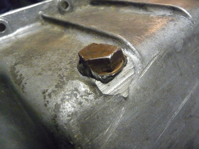 Zacząłem też przygotowywać "nową" miskę olejową. Po korku widać, że płyta pod silnikiem może się przydać - widzisz obtarcie? Druga sprawa, to silikon...