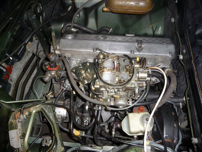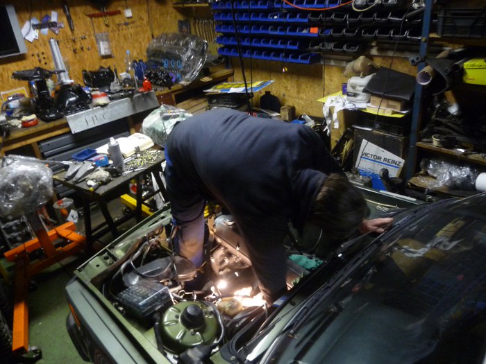 No i nadszedł nieuchronnie moment, w którym silnik wylądował pod maską. To znaczy tam, gdzie będzie pod maską, bo na razie maska leży na dachu auta. Widać z jakim poświęceniem wziąłem się do przykręcania śrubek. Prawda jest też taka, że miałem aż trzy osoby do pomocy.