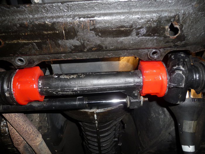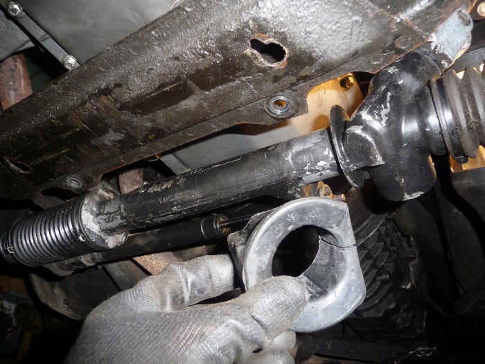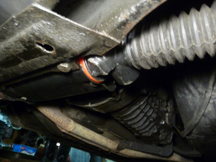 A jak już byłem w kanale, to przypomniałem sobie, że Jędrek coś mówił o wymianie poduszek mocujących przekładnię kierowniczą na poliuretany. Wziąłem się więc i za to.