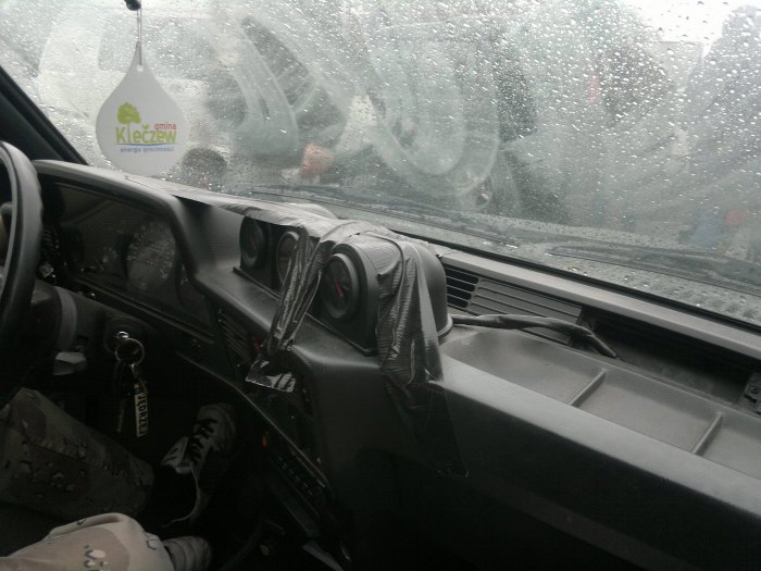 Żeby nie wiercić żadnych otworów w desce rozdzielczej, nie przymocowałem w ogóle tych dodatkowych zegarów, zostawiając tą decyzję Jędrkowi. Po roku zegary wyglądają tak, jak poniżej, bo żadnych otworów w oryginalnej desce rozdzielczej póki co nie ma :). Jędrek wpadł po prostu na pomysł nieinwazyjnego mocowania...