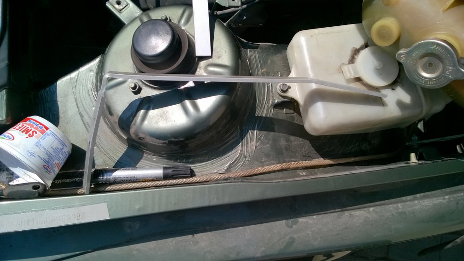 A teraz to, o czym ma być aktualizacja. Dokładałem tu chłodnicę oleju. Okazało się to totalnie niepotrzebne. Olej miał nawet przy solidnym upalaniu 75oC i nie chciał mieć więcej. Ja podejrzewałem niedziałający termostat w tej podstawce pod filtr oleju. Nieważne. Chłodnica oleju i tak wylatuje, żeby niepotrzebnej masy w aucie nie było. Teraz Jędrek wymyślił Accusump >link<, czyli akumulator ciśnienia oleju. Jak to ma działać jest opisane w linku, w skrócie - w zawodach, na długich zakrętach z dużą prędkością, brakuje oleju w misce. Układ ma za zadanie wtedy się włączyć i podać olej w silnik w zastępstwie pompy oleju. Sęk w tym, że zajmuje to trochę miejsca, którego pod maską za dużo nie ma. Filtr oleju jest po stronie pasażera, po tej stronie też jest trochę miejsca nad kolektorami wydechowymi a pod zbiorniczkiem wyrównawczym, dlatego tu zacznę kombinować z mocowaniem tego. Na zdjęciu widać wspomniany akumulator ciśnienia oleju położony na obudowie filtra powietrza, a poniżej - płaskownik aluminiowy o grubości 4mm, któy posłużył za bazę do zbudowania mocowań.