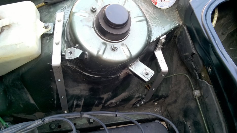 Po długiej i nierównej walce z materią udało się to draństwo powyginać i przykręcić. Otwory mocujące w karoserii wiercone były od strony koła, bo w komorze nie było już miejsca na wiertarkę. W płaskownikach też są nitonakrętki do przykręcenia obejm Accusumpa. Mocowania będą oczywiście jeszcze pomalowane.