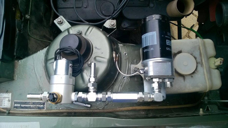 Tu widać dlaczego śruby stożkowe - mocowanie elektrozaworu jest bardzo blisko fartucha błotnika. Całość już zamocowana i skręcona na gotowo. Jedynie czujnik ciśnienia oleju do elektrozaworu okazał się nieco przeciekać, reszta była szczelna od razu.