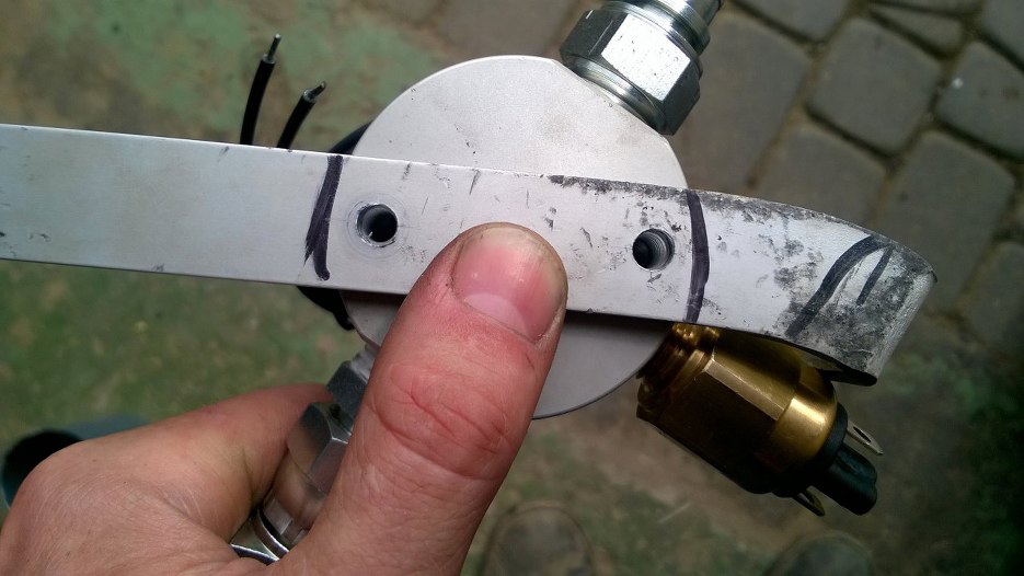 Kilka wygięć dalej wywierciłem otwory. Potem rozwierciłem je wiertłem fi 16mm żeby zawór przykręcić na śruby stożkowe.