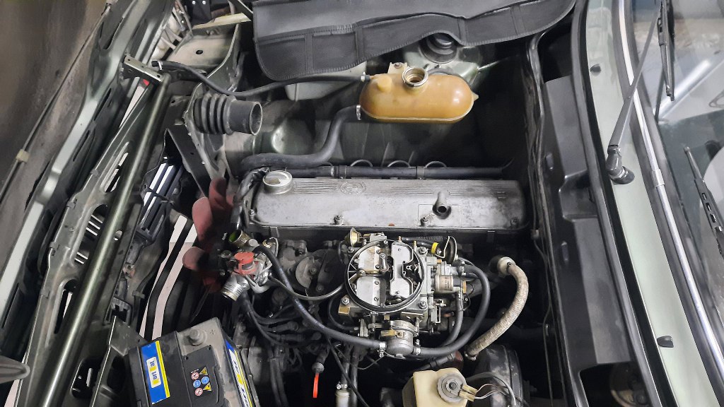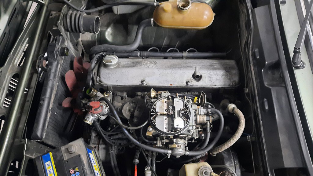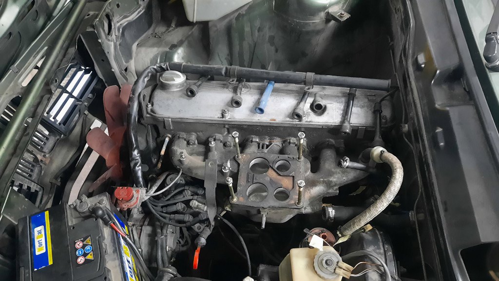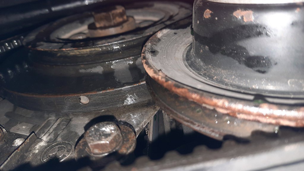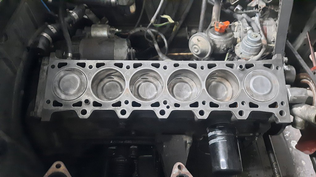 Potem poluzowałem napinacz paska rozrządu, zdjąłem pasek i odkręciłem głowicę. Znowu zapomniałem zrobić zdjęcie, ale resztki uszczelki pod głowicę dość mocno przywarły do bloku, a tłoki miały sporo zapieczonego nagaru. Oczyściłem to wszystko, trzymając przy bloku odkurzacz, żeby śmieci od razu wyciągać poza silnik. Potem odkręciłem korek układu chłodzenia i spuściłem resztkę płynu z bloku. Potem jeszcze odkręciłem filtr oleju i zlałem olej z miski. I tak trzeba go zmienić.