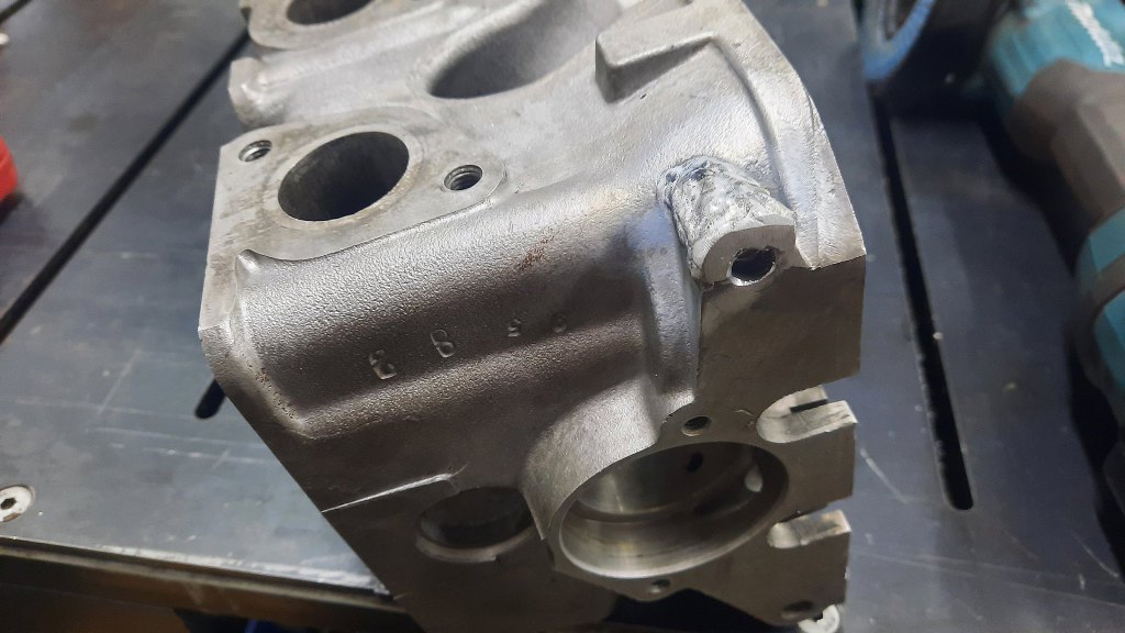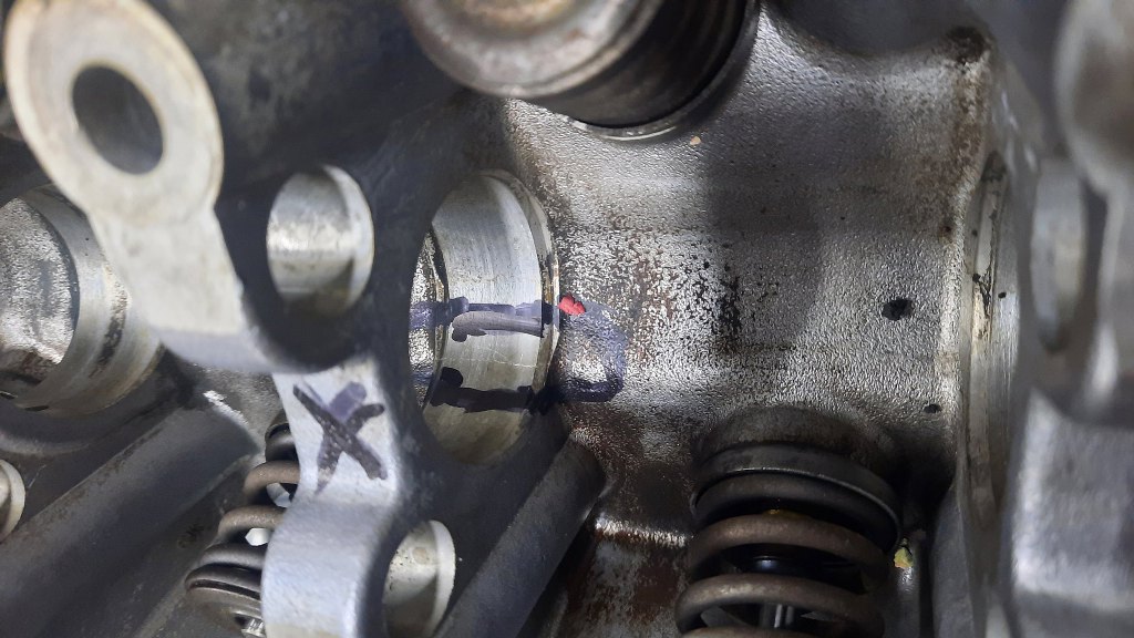 Sprawdzenie szczelności w szlifierni przebiegło dość szybko - głowica okazała się pęknięta w bardzo standardowym dla niej miejscu - w podporze wałka rozrządu. Takie pęknięcie dość skutecznie oznacza, że jest to już złom.