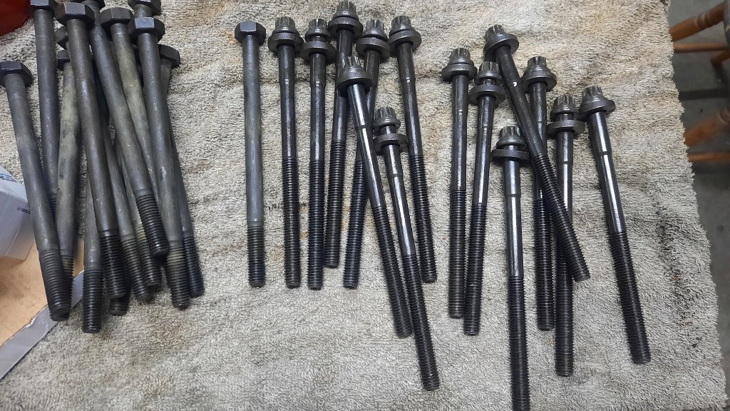 Ponieważ śruby głowicy dokręca się najpierw z momentem 30Nm, a potem dwa razy po 90 stopni, to nie chciałem ryzykować użycia starych śrub. Są nowe. Trzeba tylko było ze starych przełożyć podkładki.