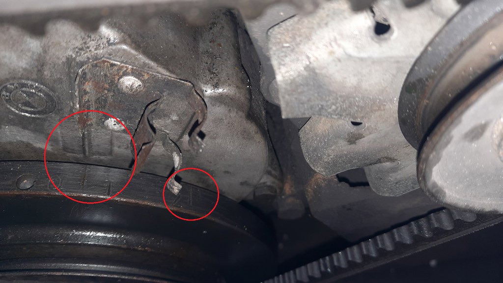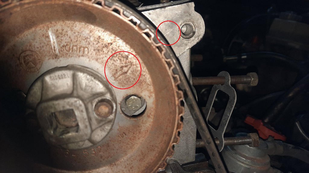 Teraz muszę ustawić rozrząd. Na kole pasowym wału korbowego są dwa znaczniki. Jeden (w większym kółku) oznacza Górny Martwy Punkt 1 cylindra, czyli miejsce ustawienia rozrządu. Ten drugi, po prawej, w mniejszym kółku jest znacznikiem, na który trzeba nastawić zapłon przy 1500 obr/min (z odpiętymi podciśnieniami od aparatu). Praktyczne. Klips pomiędzy jest na czujnik położenia wału korbowego, który teraz jest zdjęty.