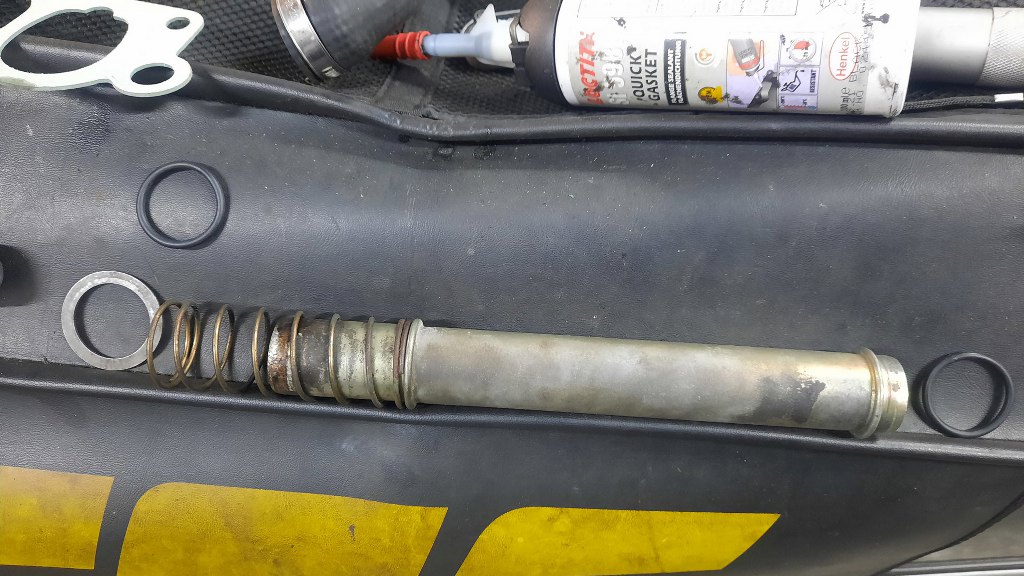 Przykręciłem teraz obudowę termostatu i założyłem rurki i chłodnicę. Wszystko musiałem umyć ze szlamu olejowego wynikającego z pękniętej głowicy.