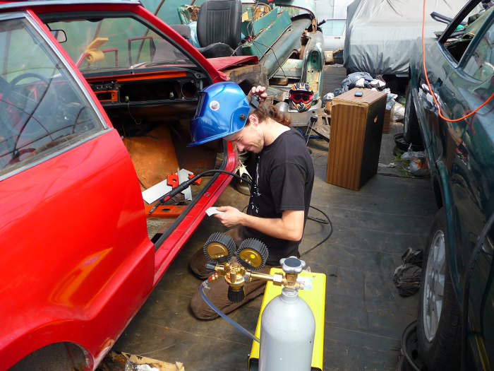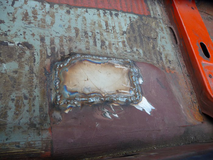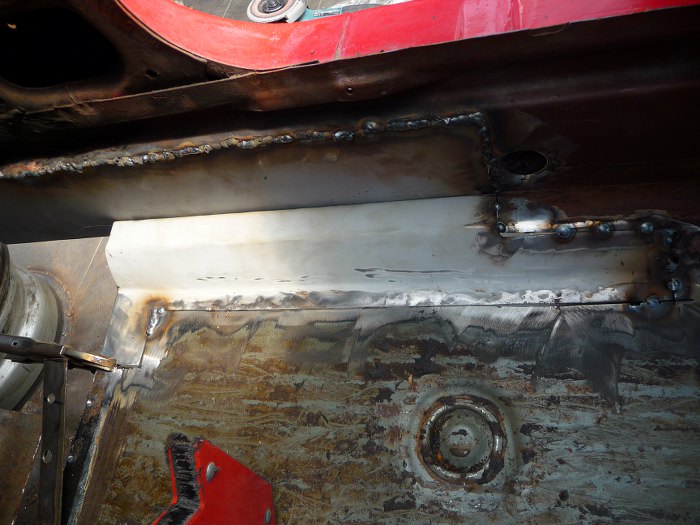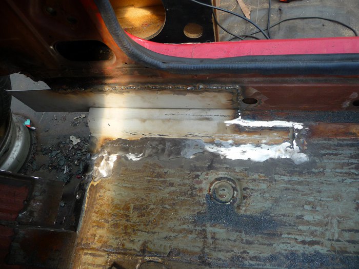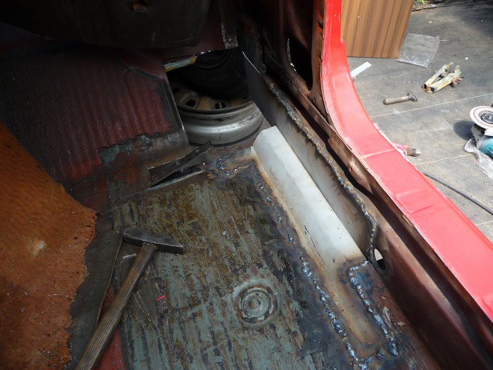 Oszołomiony sukcesem (a może dymkiem z rozgrzanych farb i zabezpieczeń podwozia) wziąłem się za zmniejszanie tej wielkiej dziury z przodu podłogi. Na początek element pionowy. Wbrew pozorom nie jest to aż takie proste, bo podczas spawania element się próbuje nieco "ściągnąć", więc trzeba pozwolić mu ostygnąć i puknąć tu i ówdzie młotkiem, żeby naprowadzić go na właściwe miejsce.