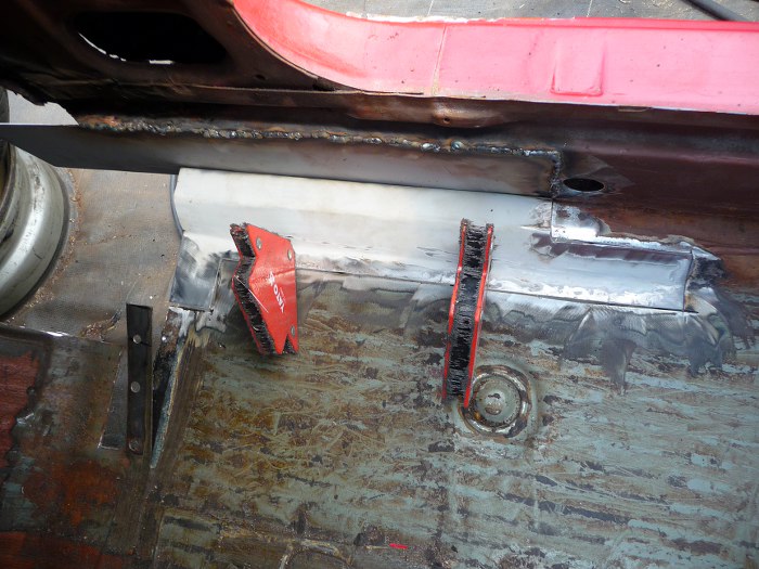 Pierwsze przyłożenie drugiej łatki. Jak widać była wcześniej pomalowana podkładem, żeby tam, gdzie blachy stykają się na zakładkę (w miejscu fabrycznego połączenia podłogi z progiem jest takie połączenie i całość jest zgrzana) było choć trochę odporności na rdzę. Natomiast do spawania podkład trzeba zeszlifować, żeby się nie palił i nie zanieczyszczał spawu.