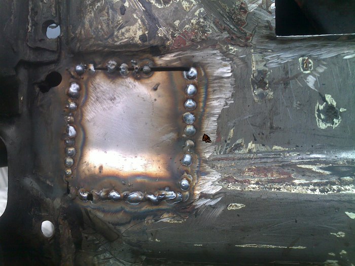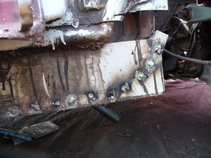 Spawamy tu tak jak było w fabryce zgrzewane. Blach nie można łączyć pod kątem prostym, bo się rozejdą, trzeba tu niestety było połączyć blachy na zakładkę.