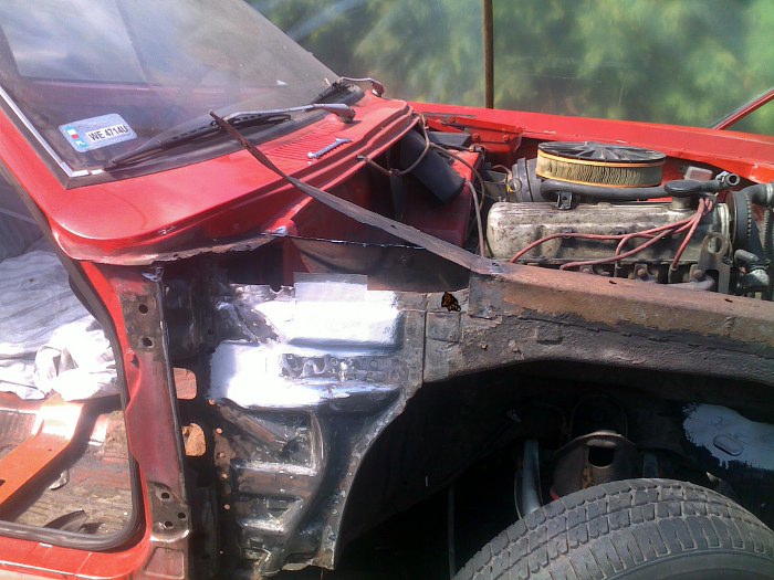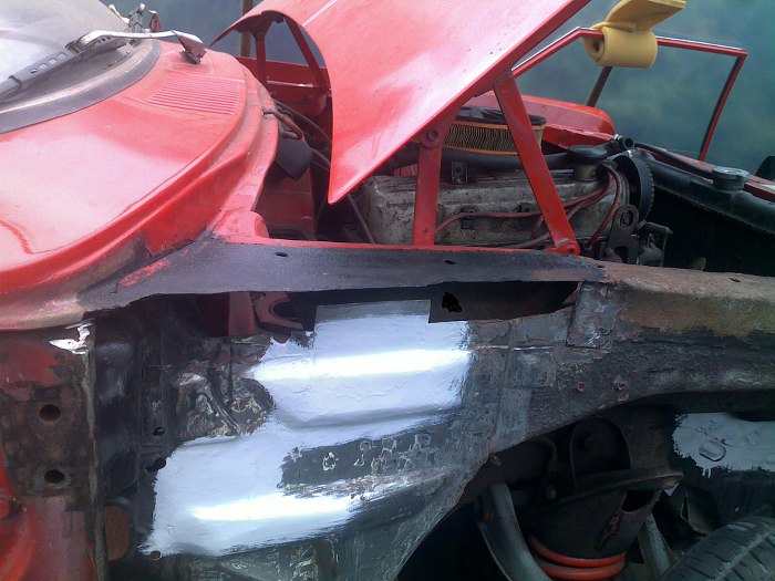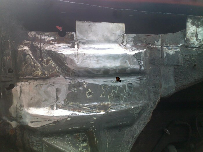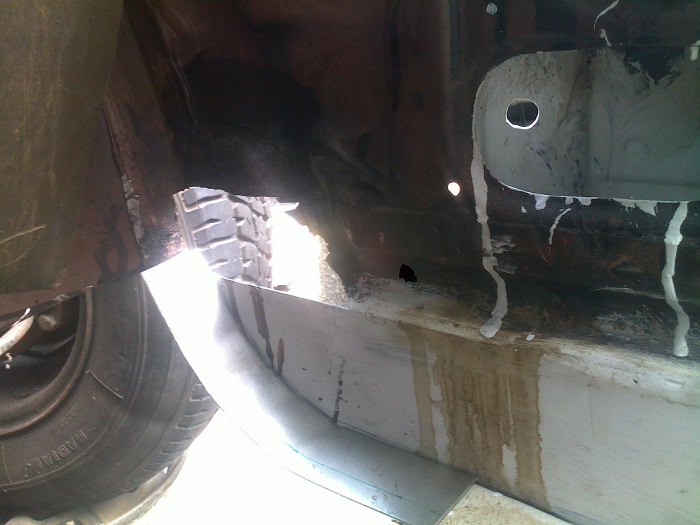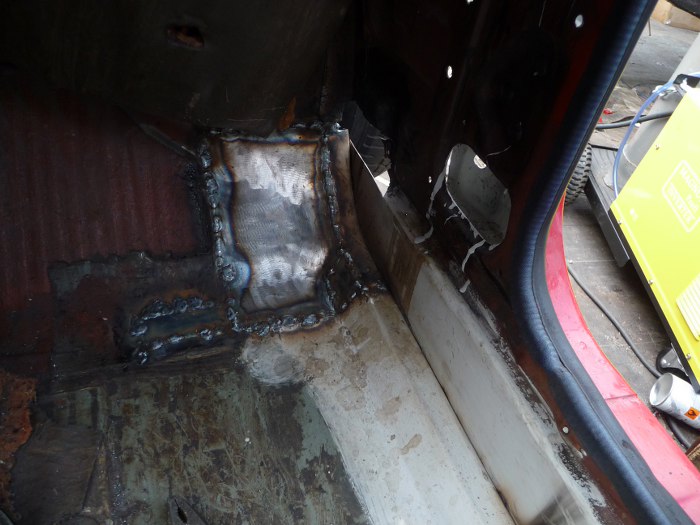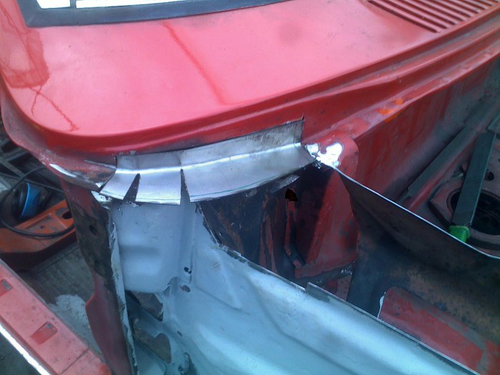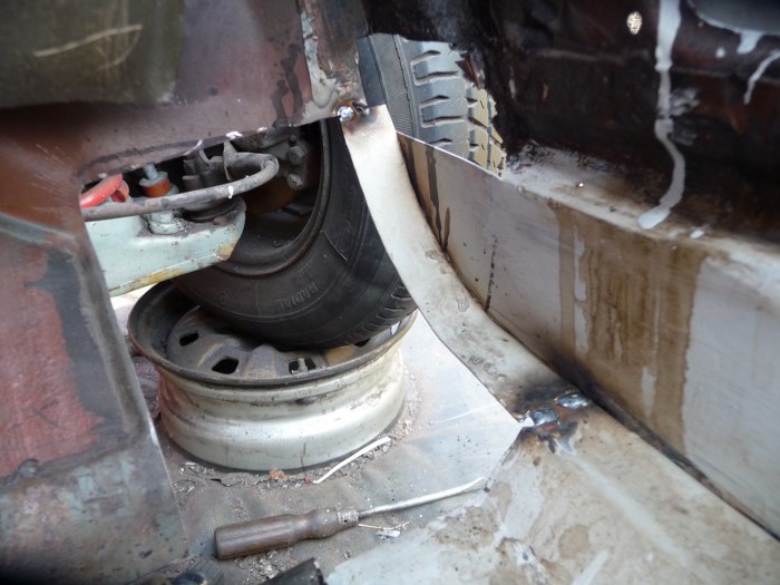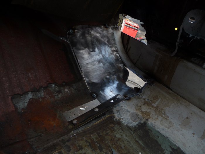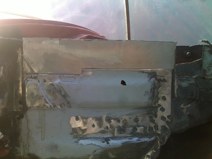 Tu widać jak ładnie są docięte i dopasowane nowe łatki. Przypomnę, że z zaawansowanych narzędzi Tomek ma do dyspozycji szlifierkę, gilotynkę do cięcia blachy, młotek i imadło.