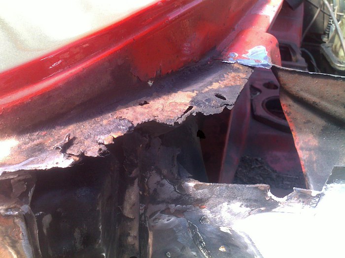 Widok po wycięciu do niczego się już nie nadających resztek blachy. Widać pod spodem kolejną dziurę i rdzawy nalot pod całym podszybiem. Całe podszybie trzeba będzie jednak zdjąć.