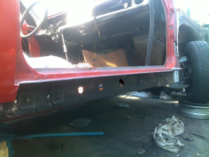 Jak już miał odpaloną szlifierkę to wyciął próg, który był i tak dziurawy i przerdzewiały. Nowy próg już leży i czeka na wstawienie, ale pod starym progiem znaleźliśmy takie cuda z rdzy, że wspawanie nowego progu trochę poczeka... Dlatego wracamy do podszybia.