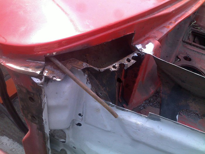 Wyciął łatki na słupek A, zastąpiły one spaprane łatanie poprzedniego fachowca. Mimo, że wcześniej nie spawał, podjął się je zaspawać i, mimo, że narzeka, że mu niezbyt wyszło, to ja sądzę, że jest bardzo przyzwoicie.