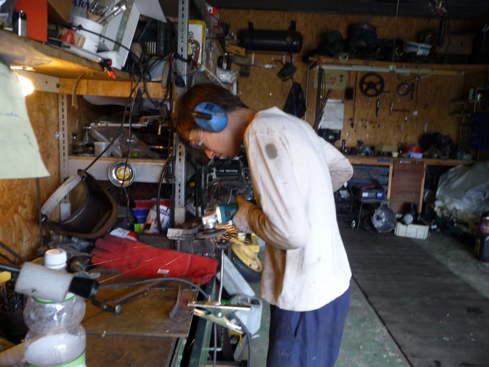 Póki co, Tomek wycina łatki. Podoba mi się, że się nie śpieszy, ale jest dokładny. Im lepiej dopasowane łatki, tym łatwiejsze spawanie i ładniejszy efekt końcowy.