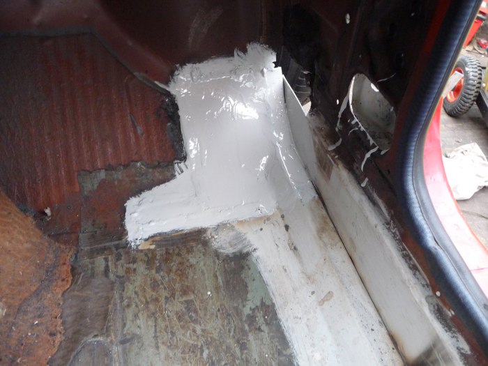 Ponieważ Tomek nie chciał sam spawać, zaczął wycinać kolejne nowe elementy. Tu widać początki łączenia podłogi ze słupkiem A.