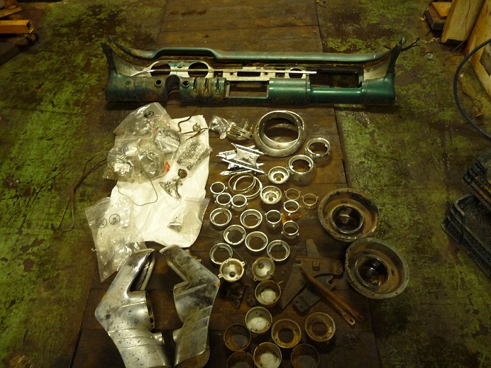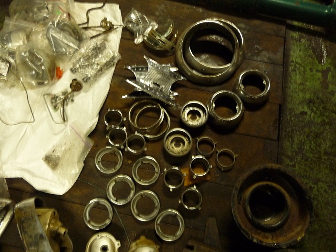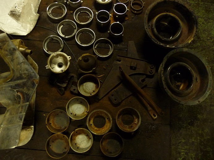 Udało mi się za to popracować w garażu. Rozłożyłem lampy przednie i tylne, dziury z błotników, deskę rozdzielczą. Wszystko przygotowane do wypiaskowania, cynkowania lub chromowania. Oj chromowanie będzie kosztować...