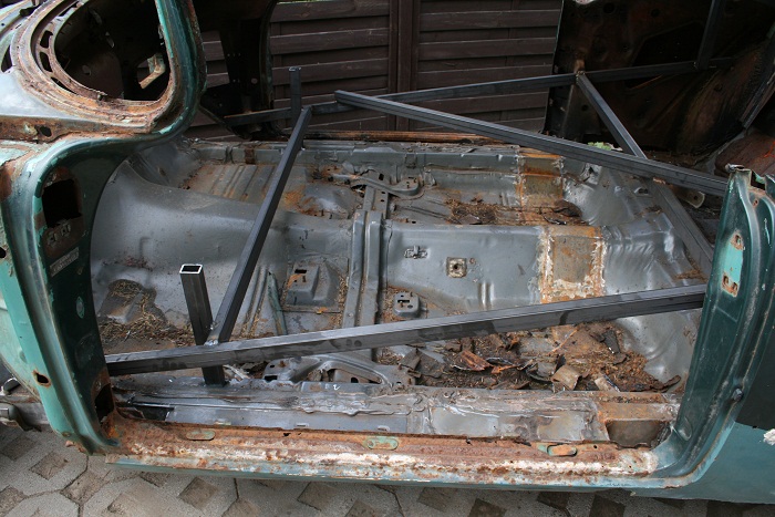 No to teraz na pocieszenie po pocięciu takiego ładnego auta kolejne zdjęcia. Na początek karoseria została nałożona na podłogę w celu wstępnego przymierzenia co pasuje, a co nie.