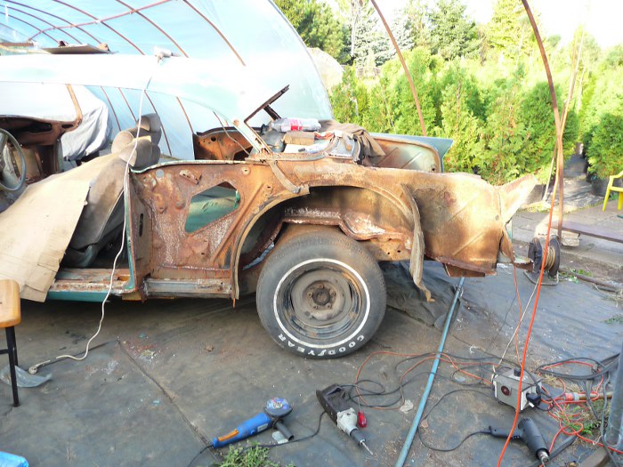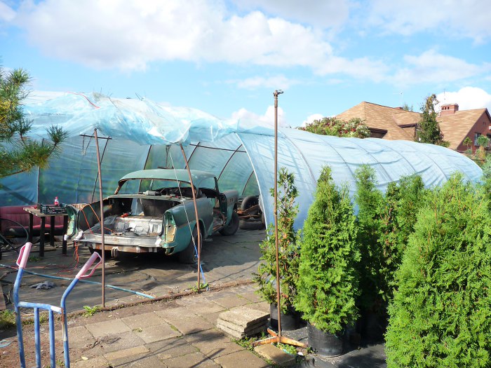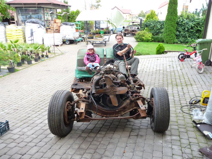 Buick wrócił na pewien czas do mnie. Najpierw musiałem zrobić nieco porządku garażu i postawić nowy, większy namiot. Na początek wpakowałem z powrotem na ramę silnik ze skrzynią, a na podłogę kanapę. Przejażdżka z córcią... :)