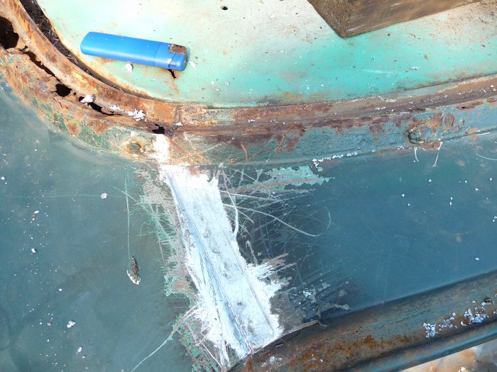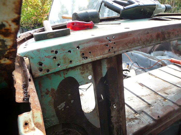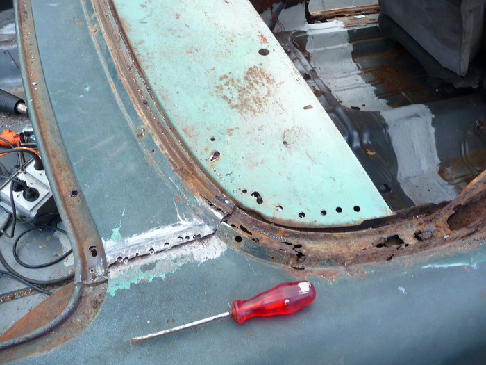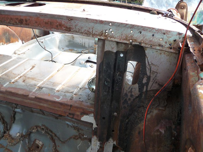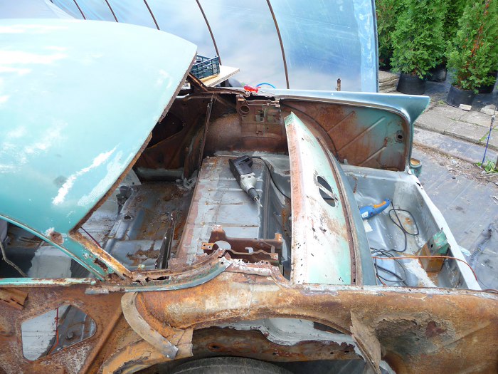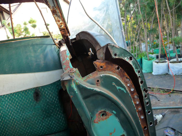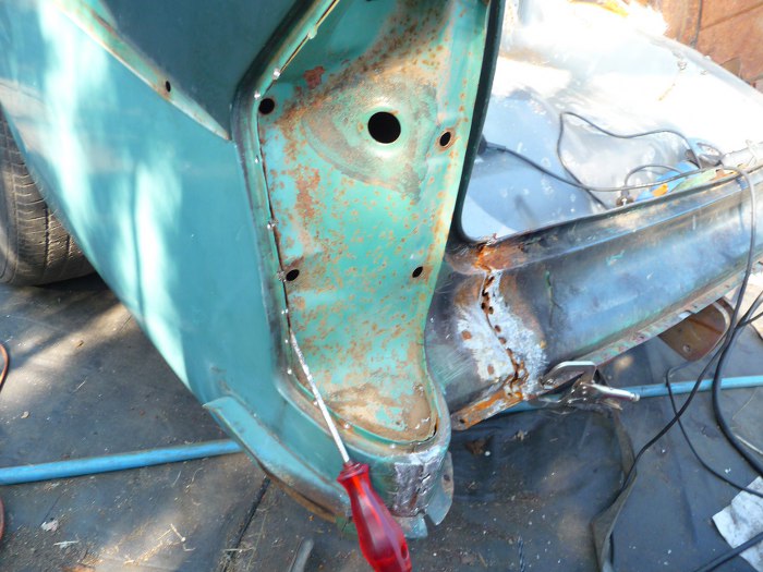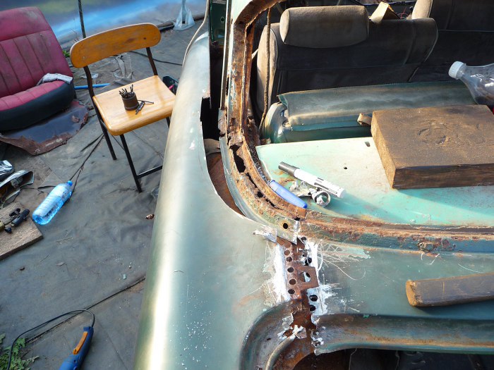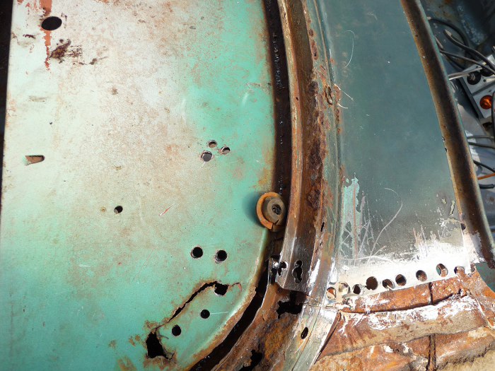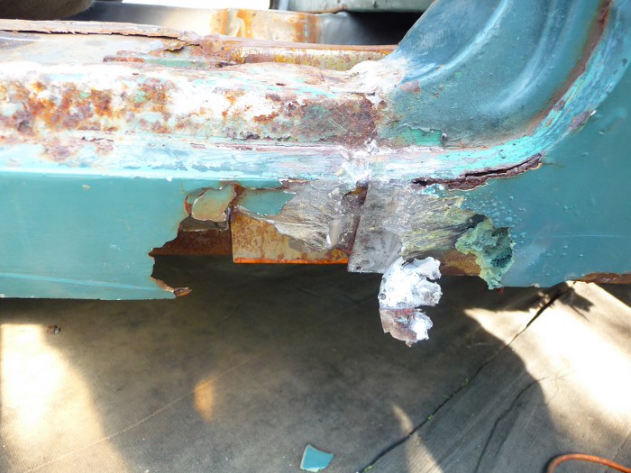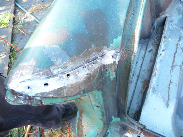 Tu łączenie błotnika z progiem, w zasadzie przerdzewiałe na wylot, ale kiedyś trzeba będzie to dorobić, więc zachowałem ile się da na wzór.