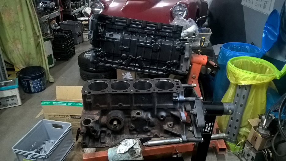 Dred trochę podrzucił mi kukułcze jajo, bo akurat mam garaż zajęty innymi projektami, ale powinno szybko pójść, bo wszystkie części już są załatwione. Znalazłem kawałek wolnego miejsca i postawiłem silnik na stojaku.