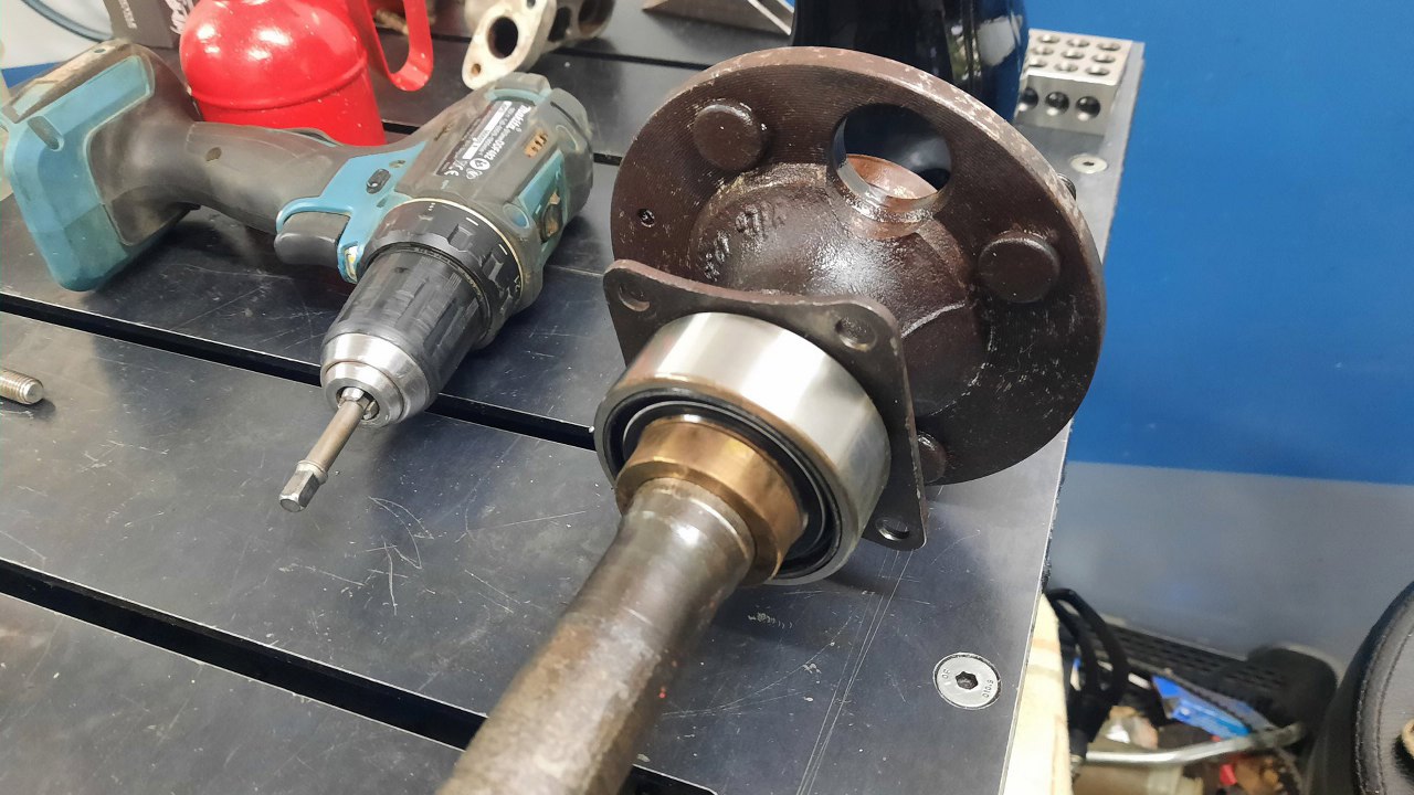 Na półosi naciąłem pierścień zaciskowy trzymający łożysko. Jak już zobaczyłem, że jest na tle cienki, że widać jego pęknięcie (jest ciaśniejszy niż jego miejsce na półosi, więc jak się go odpowiednio zeszlifuje, to pęka, ułatwiając jego zdjęcie), włożyłem całość na prasę i wycisnąłem łożysko.