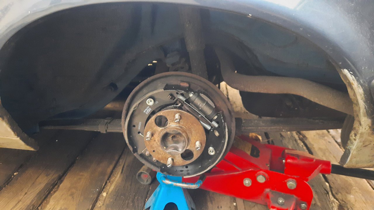 Po umyciu tarczy kotwicznej wymieniłem cylinderek hamulcowy i założyłem nowe szczęki i sprężynki.