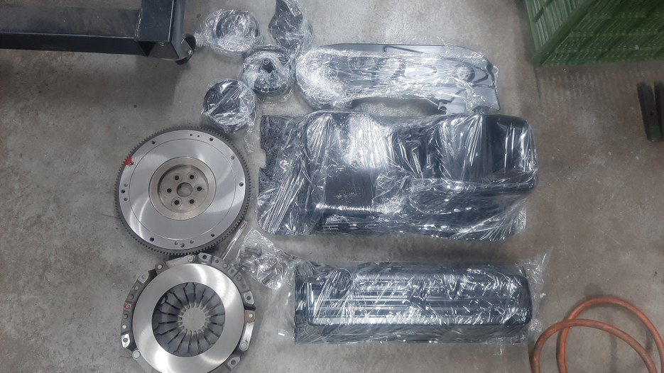 A obok rośnie kupka gotowych części - koło zamachowe i docisk po szlifie, reszta już pomalowana proszkowo.