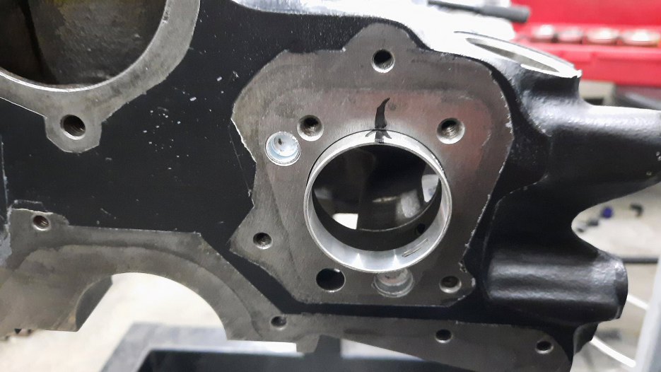 Stara panewka wałka została wybita podczas mycia, żeby nie przeszkadzała. Teraz przymierzam nową i zaznaczam pozycję, w której należy ją umieścić w bloku. Ma ona dwa wycięcia na kanały olejowe i trzeba nimi trafić na miejsce.