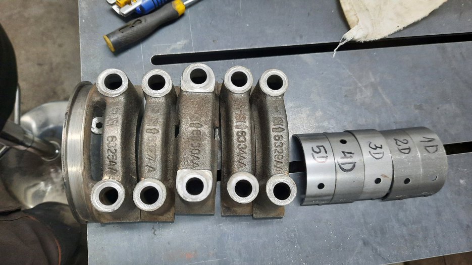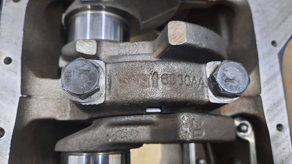 Stopy wału mają na odlewie strzałki wskazujące przód silnika. Na tym zdjęciu nad strzałką jest jakiś znaczek robaczka, a nad nim cyfry - od 1 do 5. Oznaczają one miejsce danej stopy wału w bloku.