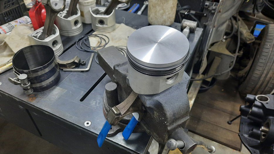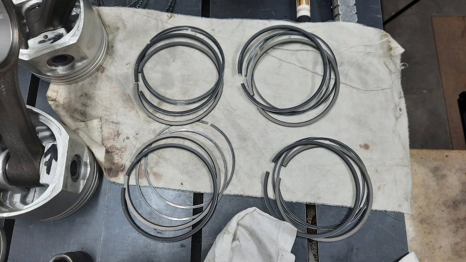 Po dokręceniu wszystkich śrub z odpowiednim momentem zabieram się za tłoki. Przygotowałem pierścienie tłokowe. Każdy z nich włożyłem do odpowiedniego cylindra i sprawdziłem szczelinomierzem luz na zamku. Jeśli byłby nieodpowiedni, to jest ten moment, żeby to wychwycić i poprawić. Teraz pierścienie leżą już na swoich miejscach i trafią do swoich cylindrów - nie będę ich już zamieniał miejscami.