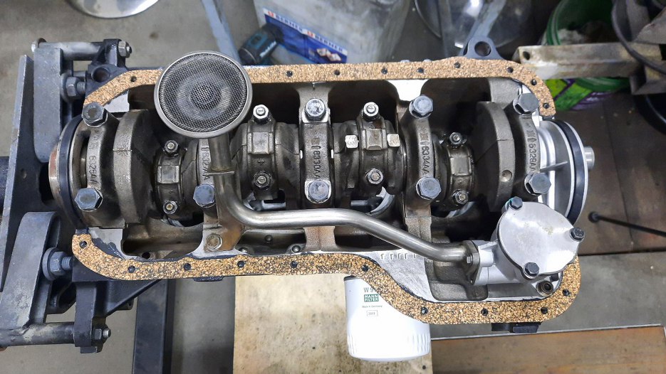 Ustawiłem wał korbowy tak, żeby pierwszy (i czwarty, jak widać) tłok był w dolnym martwym punkcie.