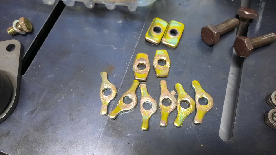 Przygotowałem podkładki pod śruby pokrywy zaworów. Każda ma swoje miejsce. W dolnym rzędzie dwie po prawej są inne - też muszą trafić w odpowiednie miejsce.