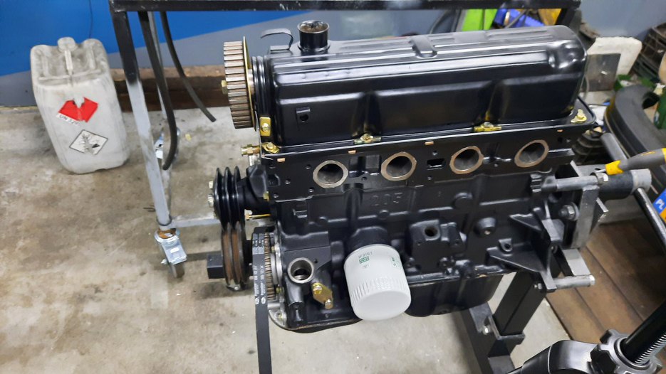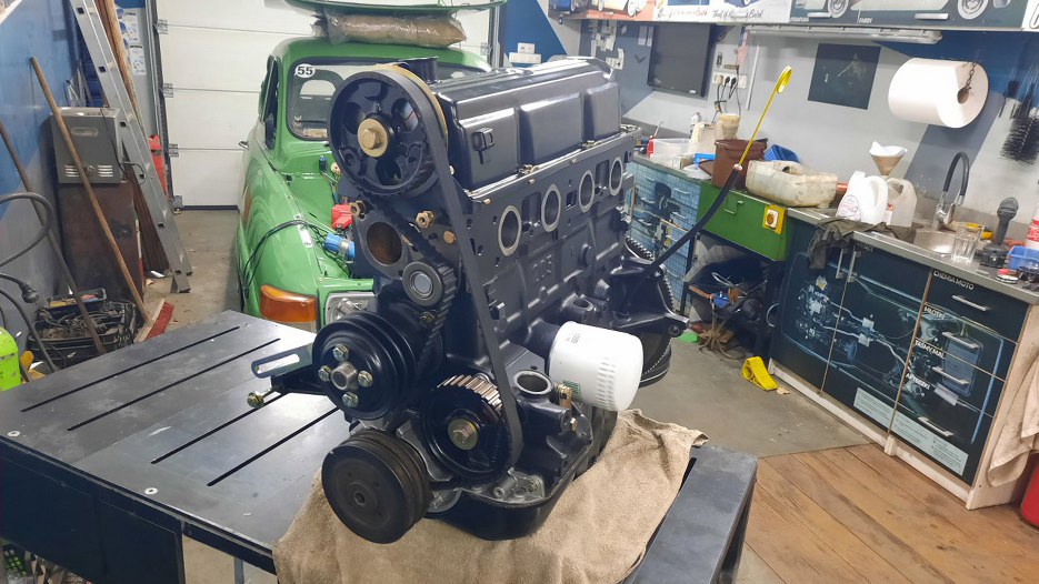 Ustawiłem rozrząd i założyłem napinacz. Brakuje mi jego jednej śruby, która jednocześnie trzyma sprężynę napinającą - to jest wciąż na silniku w Capri. Na razie przykręciłem to zwykłą śrubą i wymienię to potem. Póki co nie będę nawet kręcił tym silnikiem.