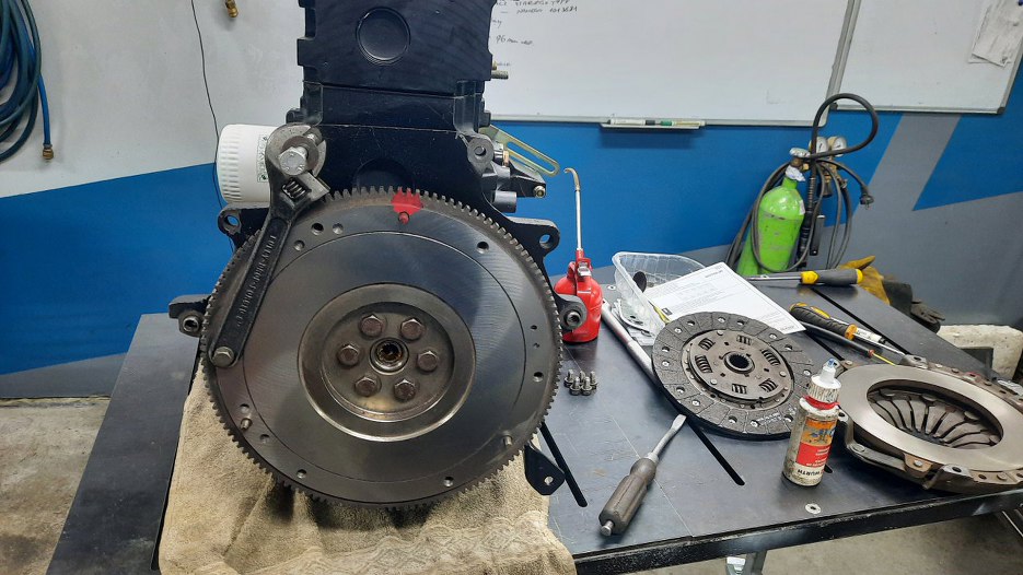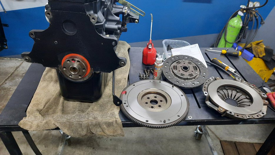 Przygotowałem koło zamachowe i sprzęgło. Wszędzie są znaki po wyważaniu, żebym mógł złożyć to w dokładnie takiej samej pozycji, jak było wyważane. Teoretycznie wszystko powinno być ok w dowolnej pozycji, ale zawsze lepiej tego dopilnować niż nie. Koło zamachowe i docisk odtłuściłem. Są one po szlifie, a sama tarcza sprzęgła ma nabite nowe okładziny.