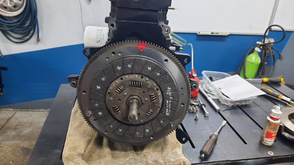 Potem założyłem i dokręciłem tarczę sprzęgła. Póki co tyle mogę zrobić, teraz poczekam na osprzęt silnika. Aha, pomiędzy koło zamachowe a blok powinna jeszcze pójść blacha - założę ją później, jest rozcięta i da się ją założyć bez zdejmowania koła.