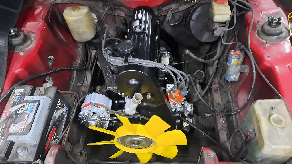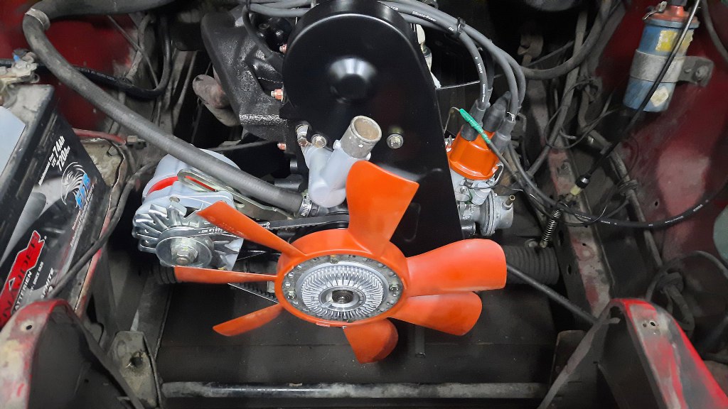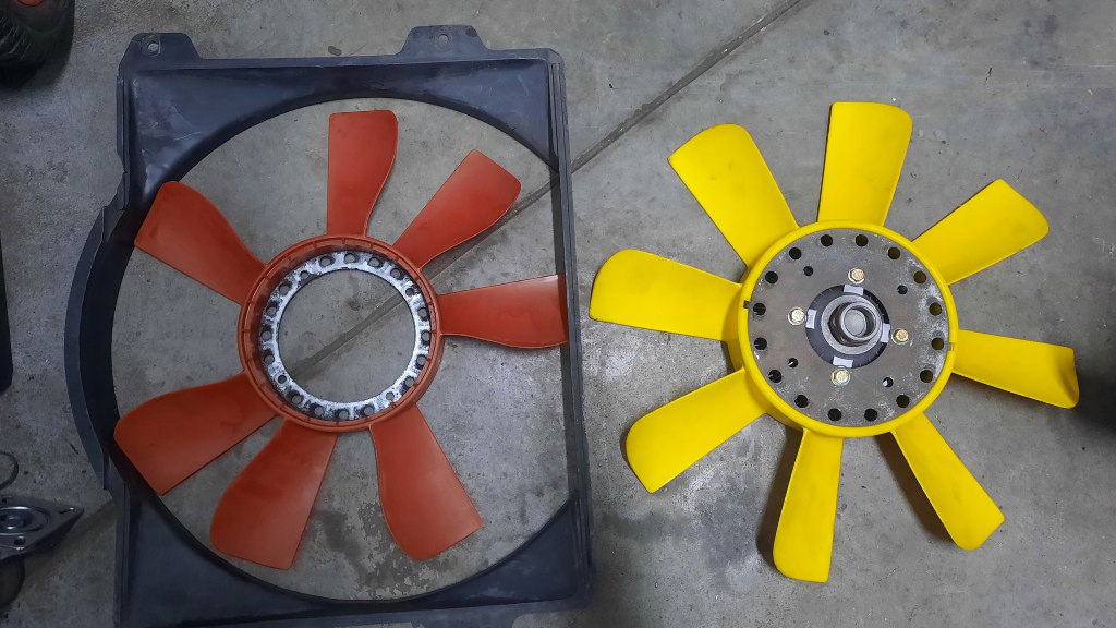 Próbowałem włożyć chłodnicę, ale nie pasowała mi jej owiewka wiatraka. Zdjąłem zatem chłodnicę i owiewkę z powrotem, odkręciłem wiatrak i poprosiłem Michała, żeby przywiózł mi z powrotem stary wiatrak, któy był na starym silniku. Okazało się, że żółty wiatrak ma większą o niecałe 2cm średnicę, co już nie pozwala założyć oryginalnej owiewki.