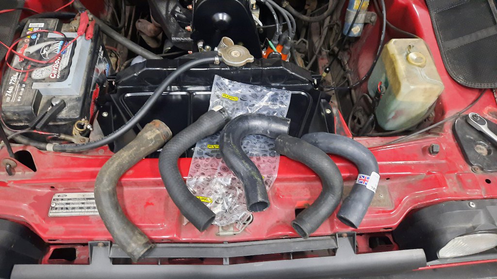 Wymienione zostały rury między silnikiem a chłodnicą. Tu mam jednocześnie stare i różne nowe do wyboru, żeby wybrać te pasujące.