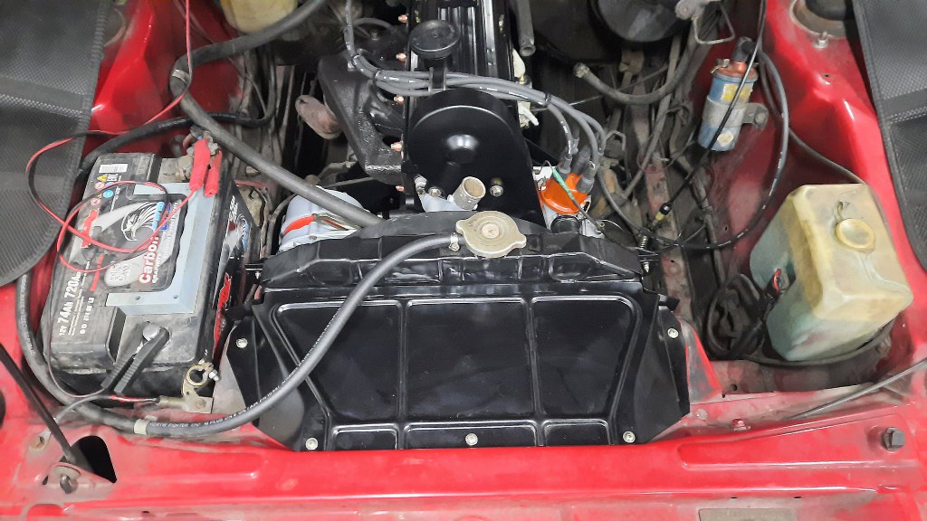 Aha, przy okazji odnowiłem też blachę przykręcaną przed chłodnicą. I zamiast na wkręty, przykręciłem ją teraz na śruby, bo wstawiłem w nadwozie nitonakrętki.